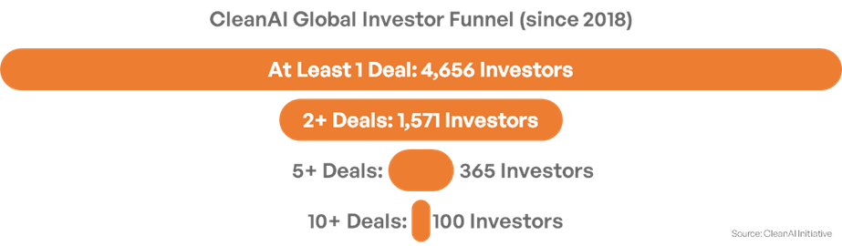 Since 2018, over 4,600 investors have participated in at least one cleanAI deal globally. This headline number signals broad curiosity and episodic engagement. One hundred of these investors demonstrate deep commitment to the sector, backing 10+ deals each.